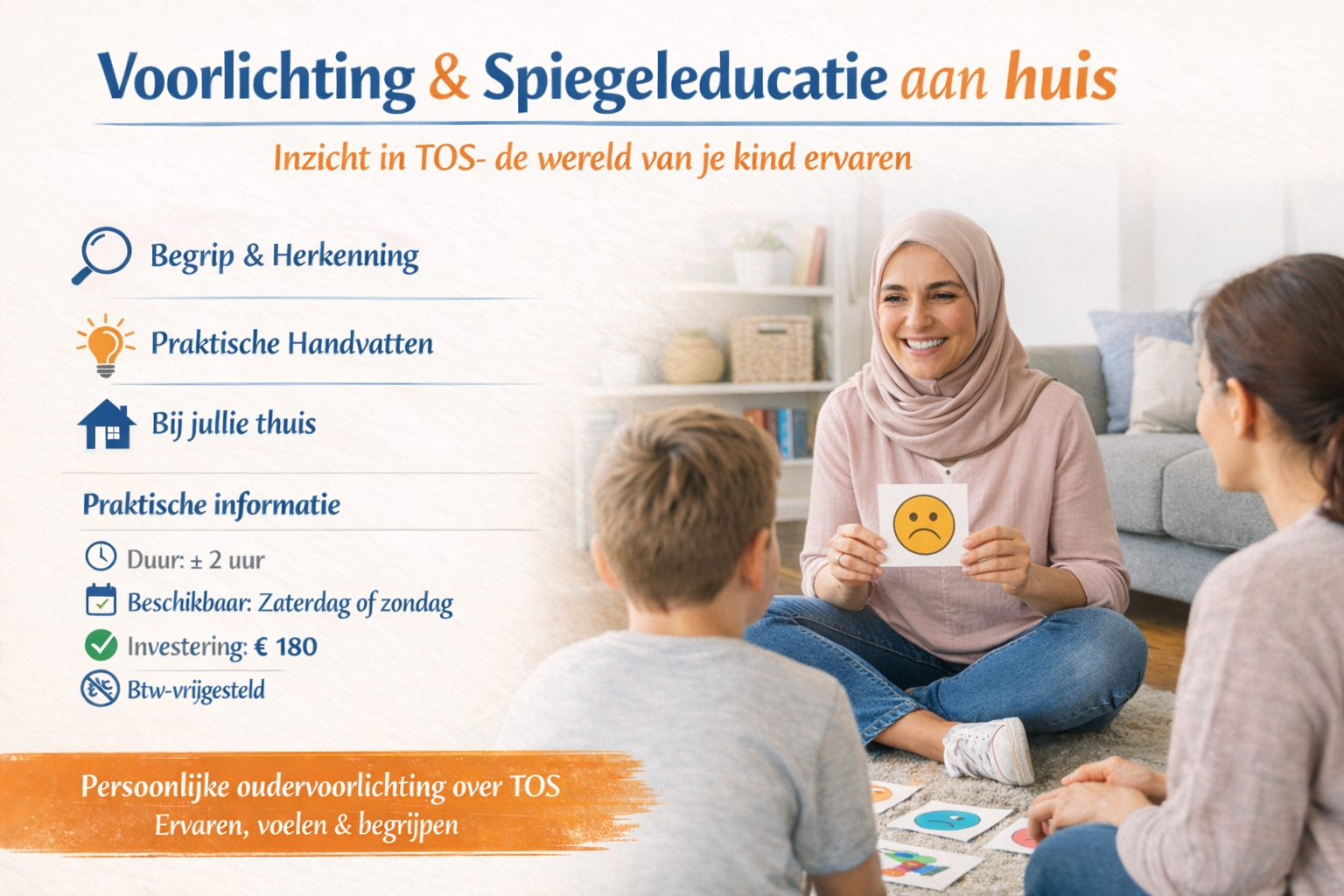 De voorlichting vindt plaats bij jullie thuis, in een vertrouwde omgeving, en wordt gegeven door een kindercoach, NLP-coach en ervaringsdeskundige met TOS.