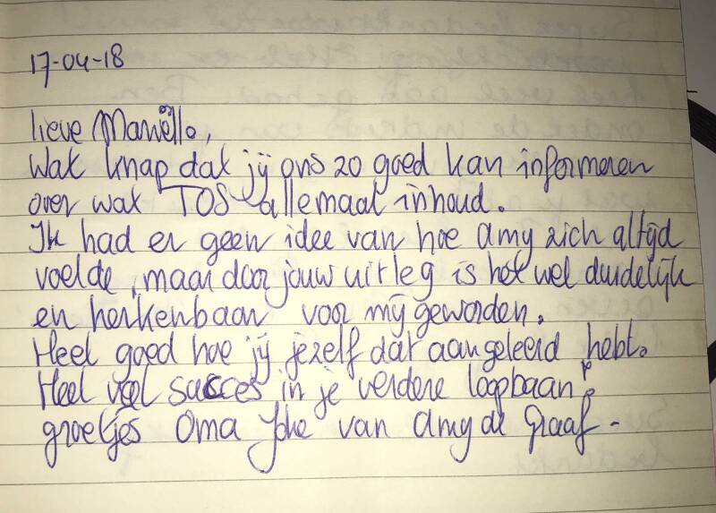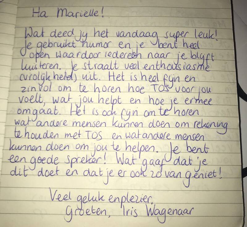 Inmiddels is het alweer een paar jaar terug dat we bij Marielle een cursus over tos gevolgd hebben. We hebben er veel aan gehad. Het had een grote meerwaarde dat Marielle vanuit haar eigen ervaring en beleving kon vertellen over tos. Het was niet slechts een theoretisch verhaal maar we konden zo echt even in de wereld van een tos meekijken. Ook door de oefeningen waarbij we een tos echt konden beleven leerden we onze dochter beter begrijpen.